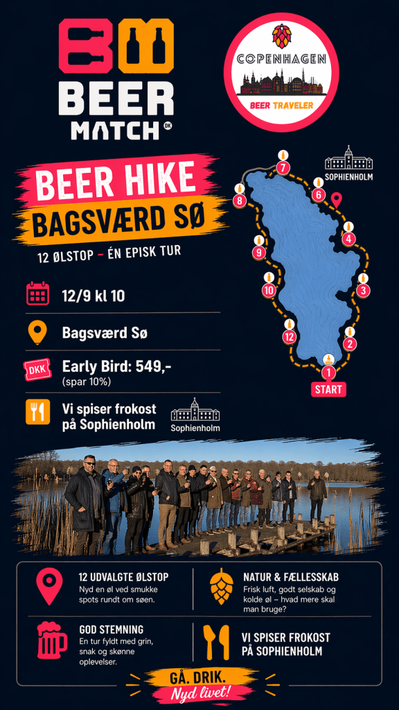 I år arrangerer jeg i samarbejde med Beermatch.dk en helt særlig og eksklusiv event omkring Bagsværd Sø. Vi skal vandre 8km, smage 12 forskellige og ret unikke øl, samt spise frokost på Sophienholm. Det hele kommer til at foregår d. 12/9. Du kan melde dig til på Beermatch.dk. Prisen er 599,- men hvis du er hurtig er der 10% rabat.